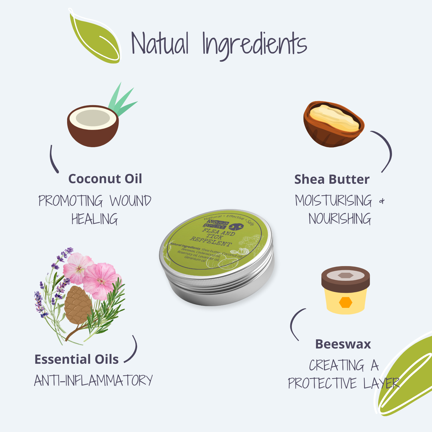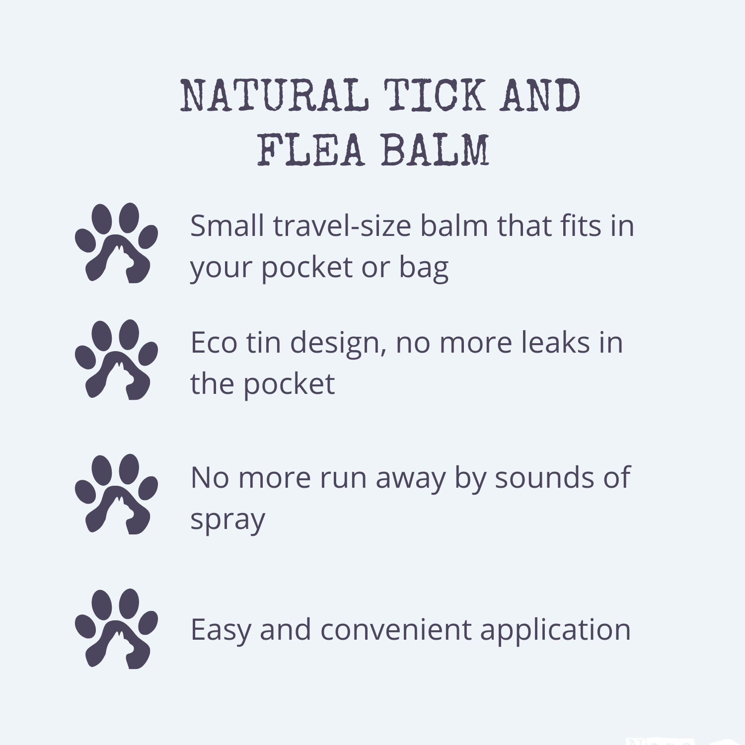 Our flea treatment comes in a balm form, which means no more messy leaks in your pocket or on your pet. The 30ML travel-sized container is perfect for pets that may be anxious around the sounds of sprays.